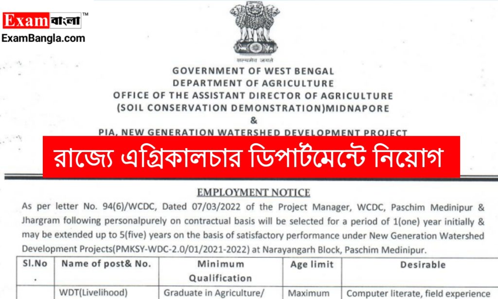 রাজ্য সরকারের এগ্রিকালচার ডিপার্টমেন্ট চুক্তিভিত্তিতে কর্মী নিয়োগের বিজ্ঞপ্তি প্রকাশ করা হয়েছে। যেকোনো ভারতীয় নাগরিক অর্থাৎ পশ্চিমবঙ্গের যেকোনো জেলার প্রার্থীরা এখানে আবেদন করতে পারবেন। আবেদন পদ্ধতি শিক্ষাগত যোগ্যতা সহ বিস্তারিত জানতে নিচে রইলো আজকের এই প্রতিবেদন।