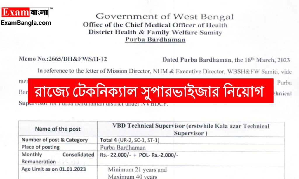 রাজ্যের স্বাস্থ্য পরিবার কল্যাণ দপ্তরের মাধ্যমে টেকনিক্যাল সুপারভাইজার নিয়োগের বিজ্ঞপ্তি করা হয়েছে। যেকোনো ভারতীয় নাগরিক অর্থাৎ পশ্চিমবঙ্গের যেকোনো জেলার প্রার্থীরা এখানে আবেদন করতে পারবেন। আবেদন পদ্ধতি শিক্ষাগত যোগ্যতা সহ বিস্তারিত জানতে নিচে রইলো আজকের এই প্রতিবেদন।