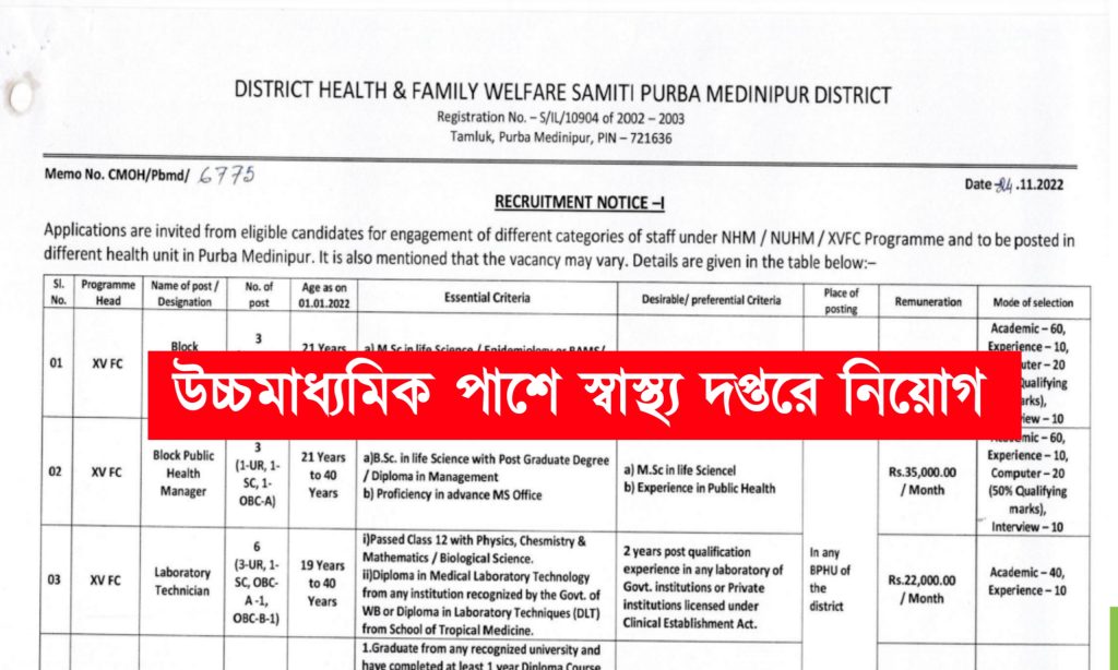 নিয়োগ স্থান- পূর্ব মেদিনীপুর জেলার ব্লক স্বাস্থ্য দপ্তরে।