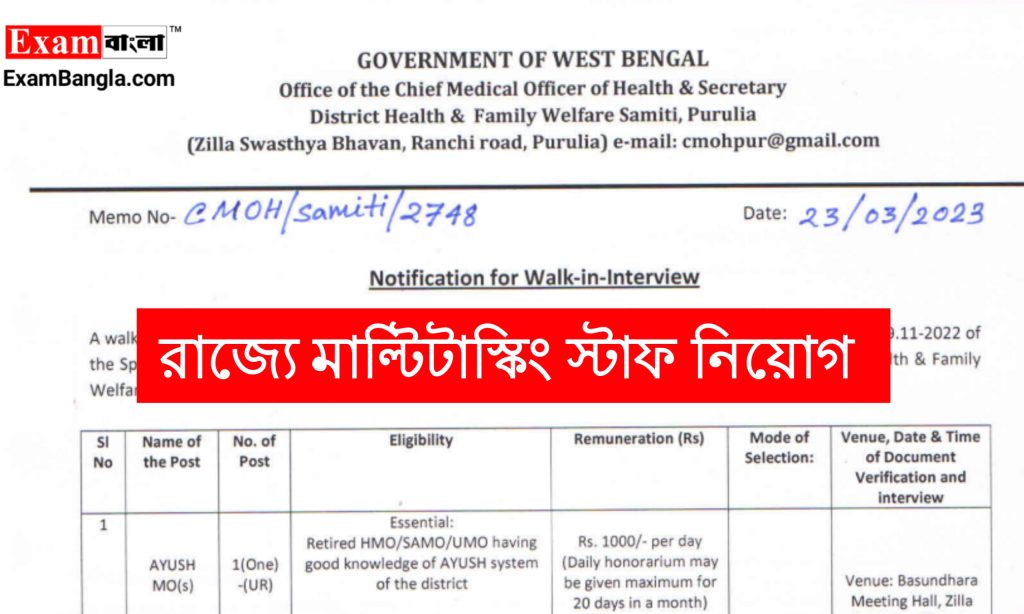 পশ্চিমবঙ্গ সরকারের স্বাস্থ্য ও পরিবার কল্যাণ দপ্তরের মাধ্যমে রাজ্যে মাধ্যমিক পাশে মাল্টি টাস্টিং স্টাফ নিয়োগের বিজ্ঞপ্তি প্রকাশ করা হয়েছে। আবেদন পদ্ধতি শিক্ষাগত যোগ্যতা সহ বিস্তারিত জানতে নিচে রইলো আজকের এই প্রতিবেদন।