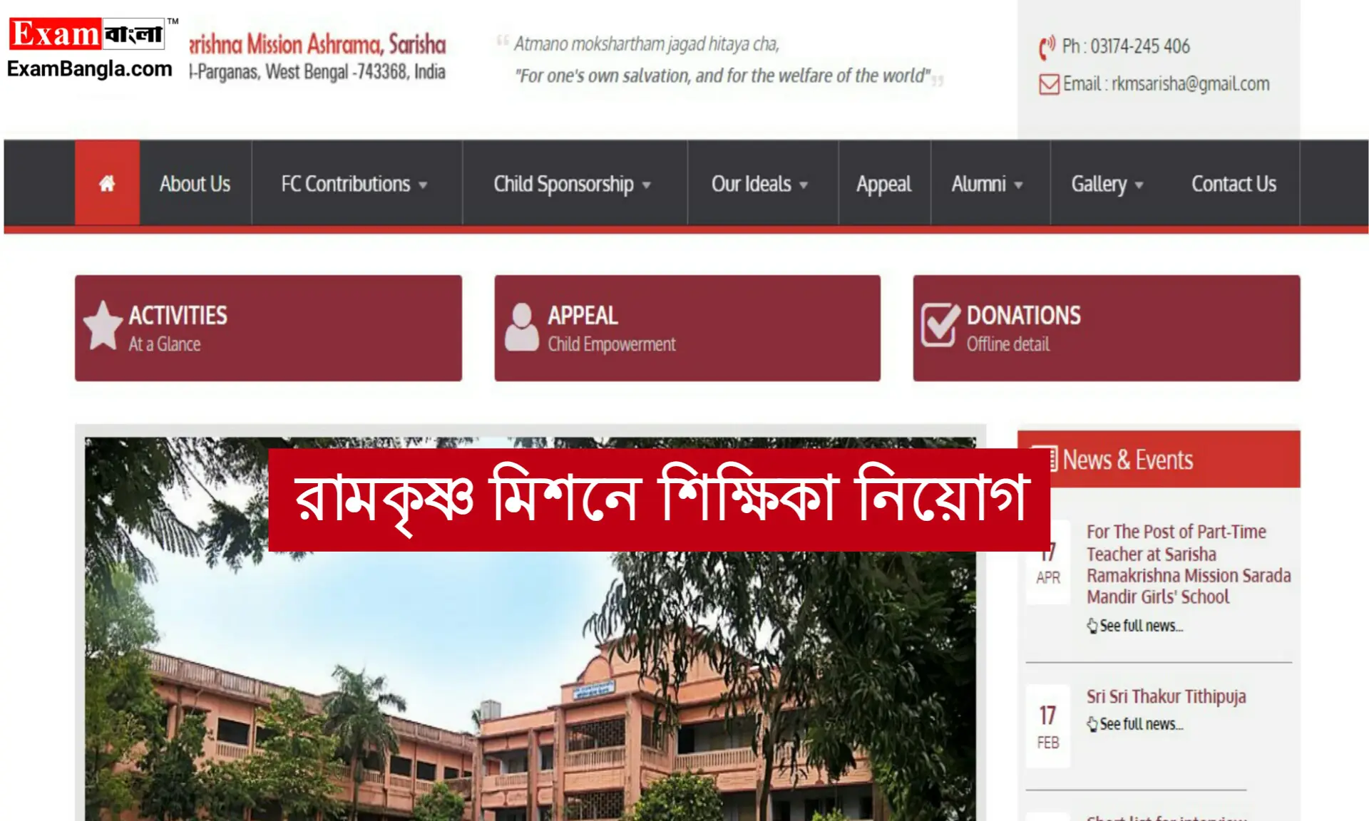 রামকৃষ্ণ মিশন সারদা মন্দির গার্লস স্কুল, সরিষার তরফে সম্প্রতি একটি শিক্ষিকা নিয়োগ বিজ্ঞপ্তি প্রকাশ করা হয়েছে। পশ্চিমবঙ্গের যেকোনো জেলার উপযুক্ত চাকরিপ্রার্থীরা এই পদের শিক্ষিকতার জন্য আবেদন করতে পারবেন। আবেদন পদ্ধতি সহ অন্যান্য বিস্তারিত তথ্য নিয়ে আজকের এই প্রতিবেদন পেশ করা হল।