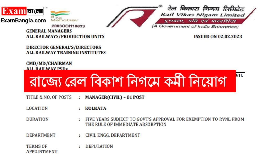 কেন্দ্রীয় সরকারের রেল বিকাশ নিগম লিমিটেডে ম্যানেজার পদে কর্মী নিয়োগের বিজ্ঞপ্তি প্রকাশ করা হয়েছে। যেকোনো ভারতীয় নাগরিক অর্থাৎ পশ্চিমবঙ্গের যেকোনো জেলার প্রার্থীরা এখানে আবেদন করতে পারবেন। আবেদন পদ্ধতি শিক্ষাগত যোগ্যতা সহ বিস্তারিত জানতে নিচে রইলো আজকের এই প্রতিবেদন।