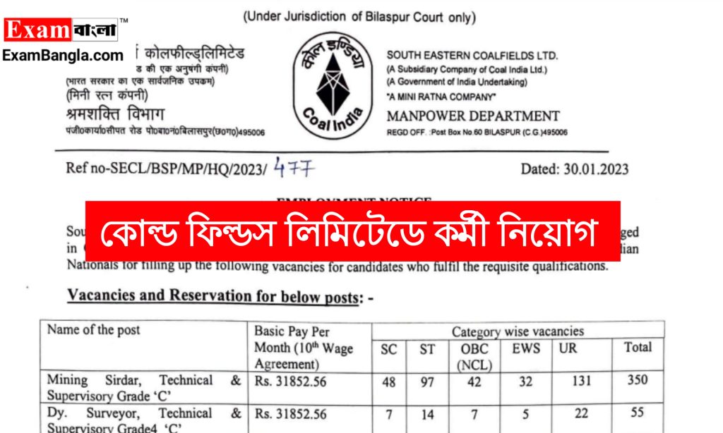 ভারত সরকারের সাউথ ইস্টার্ন কোল্ড ফিল্ডস লিমিটেডে মাধ্যমিক পাশে কর্মী নিয়োগের বিজ্ঞপ্তি প্রকাশ করা হয়েছে। যেকোনো ভারতীয় নাগরিক অর্থাৎ পশ্চিমবঙ্গের যেকোনো জেলার প্রার্থীরা এখানে আবেদন করতে পারবেন। আবেদন পদ্ধতি শিক্ষাগত যোগ্যতা সহ বিস্তারিত জানতে নিচে রইলো আজকের এই প্রতিবেদন।