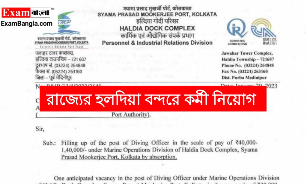 রাজ্যের শ্যামাপ্রসাদ মুখার্জী পোর্টে কর্মী নিয়োগের বিজ্ঞপ্তি প্রকাশ করা হয়েছে। যেকোনো ভারতীয় নাগরিক অর্থাৎ পশ্চিমবঙ্গের যেকোনো জেলার প্রার্থীরা এখানে আবেদন করতে পারবেন। আবেদন পদ্ধতি শিক্ষাগত যোগ্যতা সহ বিস্তারিত জানতে নিচে রইলো আজকের এই প্রতিবেদন।