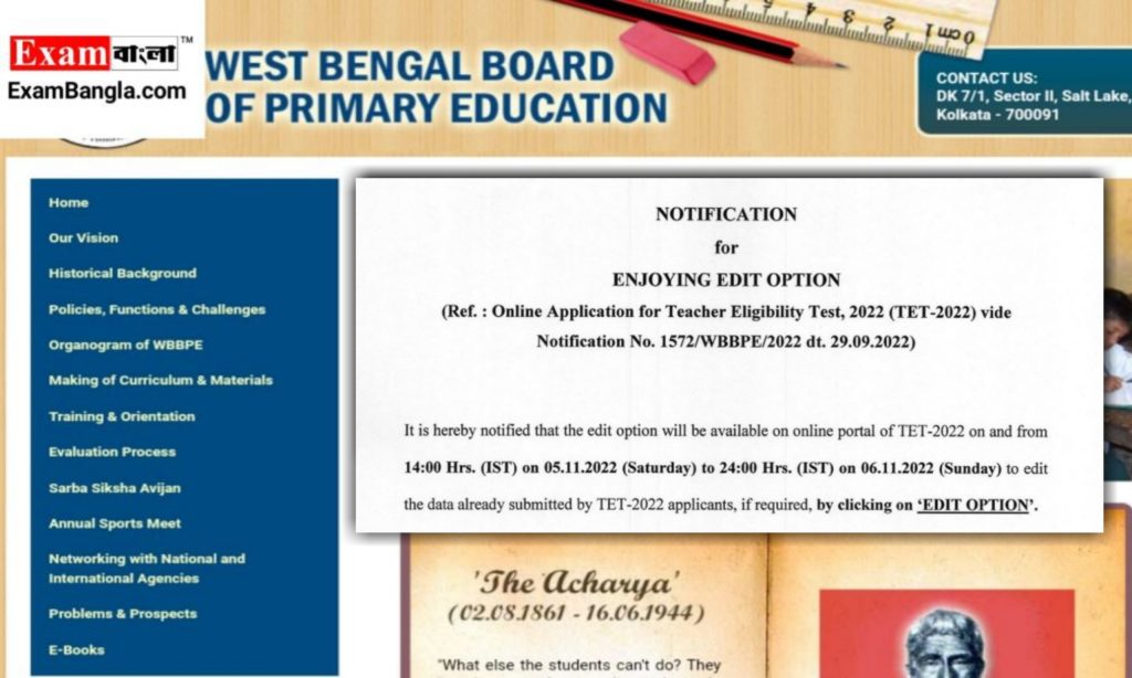 অনেক সময় দেখা যায় অনলাইনে ফর্ম ফিলাপের ক্ষেত্রে প্রচুর ভুল ভ্রান্তি থেকে যায়। যা সংশোধন তথা এডিট করার প্রয়োজন হয়। যেহেতু টেটের রেজিস্ট্রেশন প্রক্রিয়া অনলাইন ফর্ম ফিলাপের মাধ্যমে হয়েছিল সেহেতু এডিট করার প্রয়োজন থেকেই যায়। অতএব এই বিষয়টি খেয়াল রেখেই এবার টেটের আবেদনপত্রে আনা হলো “এডিট অপশন”। নির্দিষ্ট সময়ের মধ্যে অর্থাৎ ৫ই নভেম্বর দুপুর দুটো থেকে ৬ই নভেম্বর রাত বারোটার মধ্যে প্রয়োজন অনুসারে আবেদনপত্র সংশোধন করে নিতে পারবেন আবেদনকারীরা।