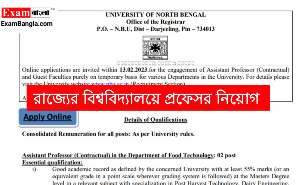 রাজ্যের নর্থ বেঙ্গল ইউনিভার্সিটিতে অ্যাসিস্ট্যান্ট প্রফেসর নিয়োগের বিজ্ঞপ্তি প্রকাশ করা হয়েছে। যেকোনো ভারতীয় নাগরিক অর্থাৎ পশ্চিমবঙ্গের যেকোনো জেলার প্রার্থীরা এখানে আবেদন করতে পারবেন। আবেদন পদ্ধতি শিক্ষাগত যোগ্যতা সহ বিস্তারিত জানতে নিচে রইলো আজকের এই প্রতিবেদন।