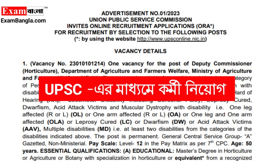 ইউনিয়ন পাবলিক সার্ভিস কমিশন (UPSC) -এর মাধ্যমে ডেপুটি কমিশনার অ্যাসিস্ট্যান্ট ডিরেক্টর সহ বিভিন্ন পদে কর্মী নিয়োগের বিজ্ঞপ্তি প্রকাশ করা হয়েছে। যেকোনো ভারতীয় নাগরিক অর্থাৎ পশ্চিমবঙ্গের যেকোনো জেলার প্রার্থীরা এখানে আবেদন করতে পারবেন। আবেদন পদ্ধতি শিক্ষাগত যোগ্যতা সহ বিস্তারিত জানতে নিচে রইলো আজকের এই প্রতিবেদন।