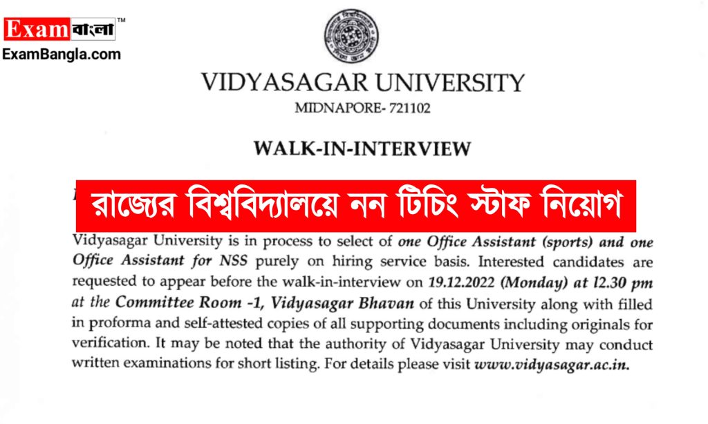 রাজ্যে বিদ্যাসাগর ইউনিভার্সিটিতে নন টিচিং স্টাফ পদে কর্মী নিয়োগের বিজ্ঞপ্তি প্রকাশ করা হয়েছে। যেকোনো ভারতীয় নাগরিক অর্থাৎ পশ্চিমবঙ্গের যেকোনো জেলার প্রার্থীরা এখানে আবেদন করতে পারবেন। আবেদন পদ্ধতি শিক্ষাগত যোগ্যতা সহ বিস্তারিত জানতে নিচে রইলো আজকের এই প্রতিবেদন।