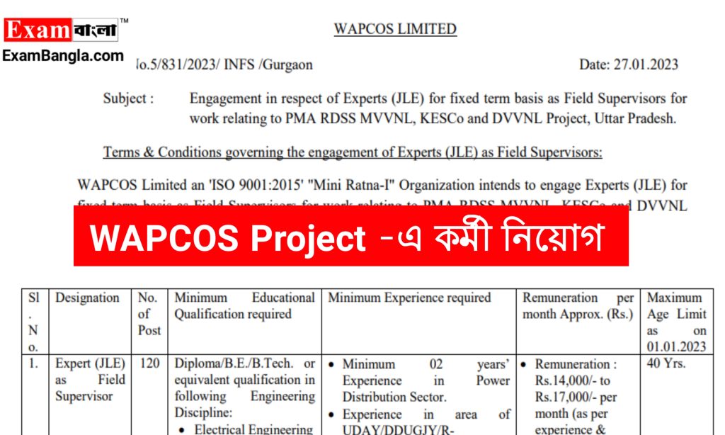 ইন্টারভিউ স্থান- WAPCOS Project Office, Lucknow, 3/309, Vikrant Khand, Gomit Nagar, Lucknow ( UP)-226010