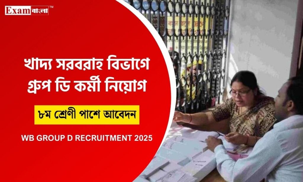 WB Group D Recruitment: পশ্চিমবঙ্গ রাজ্যের আবারো অষ্টম শ্রেণী পাশে গ্রুপ ডি পদে কর্মী নিয়োগের বিজ্ঞপ্তি প্রকাশিত হল। সম্প্রতি রাজ্যের খাদ্য ও সরবরাহ দপ্তর থেকে রাজ্যের চাকরিপ্রার্থীদের জন্য এই দুর্দান্ত সুখবর প্রকাশ করা হয়েছে। অষ্টম শ্রেণির যোগ্যতায় বিপুল পরিমাণে চাকরি প্রার্থীরা নিয়োগ বিজ্ঞপ্তি জন্য অপেক্ষা করে থাকেন। এবার সেই সমস্ত চাকরিপ্রার্থীদের অপেক্ষার অবসান ঘটিয়ে চুক্তিভিত্তিক পদের জন্য প্রকাশিত হলো নিয়োগ বিজ্ঞপ্তি। এই নিয়োগ সম্পর্কিত যাবতীয় তথ্য EXAM BANGLA র পক্ষ থেকে প্রকাশ করা হলো। আগ্রহী প্রার্থীরা এখনই বিস্তারিত জেনে নিন।