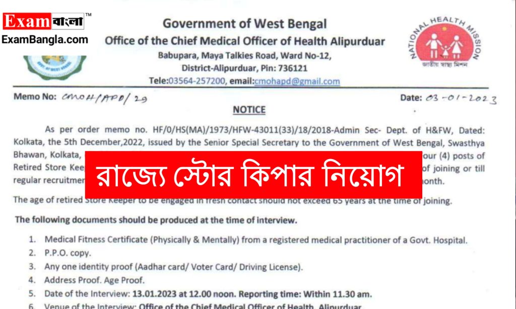 জাতীয় স্বাস্থ্য মিশনে আওতায় রাজ্যের স্বাস্থ্য দপ্তরে চুক্তিভিত্তিক স্টোর কিপার নিয়োগের বিজ্ঞপ্তি প্রকাশ করা হয়েছে। সরাসরি ইন্টারভিউয়ের মাধ্যমে চাকরির সুযোগ। আবেদন পদ্ধতি শিক্ষাগত যোগ্যতা সহ বিস্তারিত জানতে নিচে রইলো আজকের এই প্রতিবেদন। WB Health Department Recruitment 2023