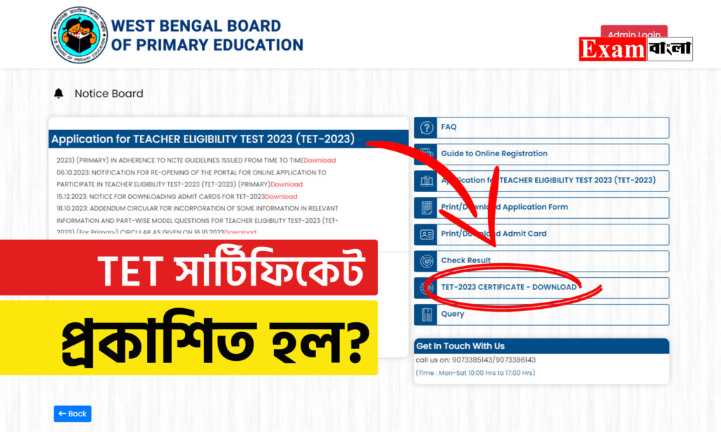 মধ্য শিক্ষা পর্ষদের অফিসিয়াল ওয়েবসাইটে মেন্টেনেন্স সংক্রান্ত কাজের কারণে দীর্ঘ সময় কোনও আপডেট দেওয়া হয়নি। বর্তমানে দেখা যাচ্ছে ওয়েবসাইটটিতে সাম্প্রতিক কিছু আপডেট করা হয়েছে। যেখান Primary TET 2023 সংক্রান্ত অপশনগুলি চালু করা হয়েছে। বিভিন্ন অপশনের মধ্যে Check Result এবং TET-2023 CERTIFICATE – DOWNLOAD অপশন আছে। নির্দিষ্ট এই দুটি অপশনে ক্লিক করলে Registration No এবং DOB সাবমিট অপশনের নিচে Download Your Certificate বটন আছে। তবে, তথ্য সাবমিট করার পরেও এখনও কোনো সার্টিফিকেট ডাউনলোড হচ্ছে না। কারণ, ২০২৩ সালে আয়োজিত টেট পরীক্ষার রেজাল্ট এখনও প্রকাশিত হয়নি।