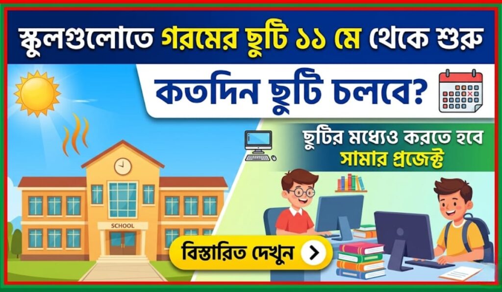 সম্প্রতি রাজ্যের স্কুল শিক্ষা দপ্তরের তরফ থেকে একটি গুরুত্বপূর্ণ ঘোষণা এসেছে। রাজ্যের সমস্ত স্কুলগুলোতে ১১ মে থেকে গরমের ছুটি (WB Summer Vacation 2026) শুরু হতে চলেছে। গরমের তীব্র দাবদাহ আর অস্বস্তি থেকে পড়ুয়াদের রেহাই দিতেই এই সিদ্ধান্ত। তবে স্কুলগুলোতে ছুটি চললেও পড়াশোনা থেমে থাকবে না পড়ুয়াদের। সেজন্য এ বছর থেকে নতুন উদ্যোগ ‘সামার প্রজেক্ট’ চালু করা হচ্ছে। বিস্তারিত পড়ুন আজকের প্রতিবেদনে।