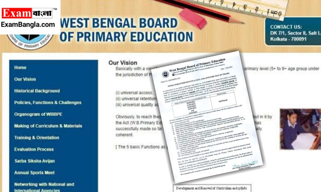 প্রকাশ পেল প্রাইমারি টেটের অষ্টম পর্যায়ের ইন্টারভিউর দিনক্ষণ। সম্প্রতি অফিসিয়াল ওয়েবসাইটে বিজ্ঞপ্তির মাধ্যমে ইন্টারভিউর তারিখ ঘোষণা করা হয়েছে। জানা যাচ্ছে, এই পর্যায়ে হাওড়া জেলার চাকরিপ্রার্থীদের ইন্টারভিউ ও অ্যাপটিটিউড টেস্ট নেওয়া হবে। এই সম্পর্কিত বিজ্ঞপ্তিটি দেখার জন্য পর্ষদের অফিসিয়াল ওয়েবসাইটে (wbbpe.org) যেতে হবে প্রার্থীদের।