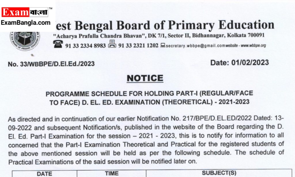 প্রসঙ্গত, ডি.এল.এড পার্ট ওয়ান ফাইনাল সেমিস্টারের থিওরি পরীক্ষার সূচিও প্রকাশ করেছে বোর্ড। সেখানে বলা হয়েছে আগামী ৯/০৩/২৩ তারিখ সকাল ১০:০০টা থেকে দুপুর ১:০০টা পর্যন্ত চাইল্ড স্টাডিজের পরীক্ষা থাকছে। ওইদিনই দুপুর ২:০০টো থেকে বিকেল ৫:০০টা পর্যন্ত থাকছে প্রথম ভাষার পরীক্ষা। এরপর ১০/০৩/২৩ তারিখ সকাল ১০:০০টা থেকে দুপুর ১:০০টা পর্যন্ত হবে দ্বিতীয় ভাষার পরীক্ষা। আর একই দিনে দুপুর ২:০০টো থেকে বিকেল ৫:০০টা পর্যন্ত হবে পরিবেশ বিদ্যা (এনভায়রনমেন্টাল সায়েন্সের) পরীক্ষা। এরপর আগামী ১১/৩/২৩ তারিখ সকাল ১০:০০টা থেকে দুপুর ১:০০টা পর্যন্ত থাকবে গণিত বিষয়ের পরীক্ষা।