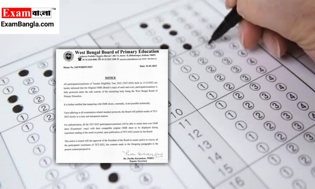 এরইমধ্যে ওএমআর শিট বিষয়ক একটি বিজ্ঞপ্তিতে পর্ষদের তরফে জানানো হয়েছে, অতি শীঘ্রই টেটের ফলাফল প্রকাশের সিদ্ধান্ত যেমন নেওয়া হচ্ছে তেমনই স্বচ্ছতা বজায় রাখতে এবার রেজাল্টের সাথে পরীক্ষার্থীদের ওএমআর শিটগুলি ওয়েবসাইটে আপলোড করার একটি সম্ভাবনা রয়েছে। যার দ্বারা পরীক্ষার্থীরা তাঁদের কাছে থাকা উত্তরপত্রের প্রতিলিপির সাথে প্রাপ্ত নম্বর ও অরিজিনাল উত্তরপত্রটি মিলিয়ে নিতে পারবেন।