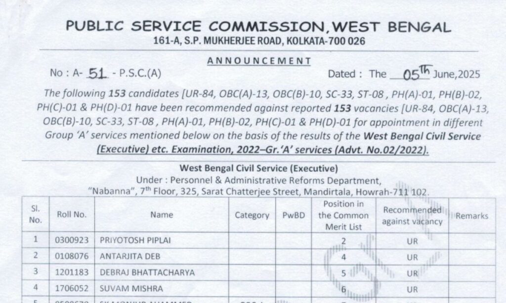 West Bengal Civil Services (WBCS Result 2022)