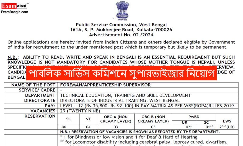 পাবলিক সার্ভিস কমিশন পশ্চিমবঙ্গ সরকারের পক্ষ থেকে নতুন একটি নিয়োগের বিজ্ঞপ্তি প্রকাশ করা হয়েছে সম্প্রতি। রাজ্যের অধীনস্থ কারিগরি শিক্ষা দপ্তরের বেশ কিছু শূন্যপদে নিয়োগ করা হবে এই বিজ্ঞপ্তির মাধ্যমে। যেকোনো ভারতীয় নাগরিক পশ্চিমবঙ্গের প্রতিটি জেলা থেকে এখানে চাকরির জন্য আবেদন জানাতে পারবেন। শিক্ষাগত যোগ্যতা, আবেদন পদ্ধতি, মাসিক বেতন সহ অন্যান্য বিস্তারিত তথ্য উল্লেখ করা হল আজকের প্রতিবেদন।