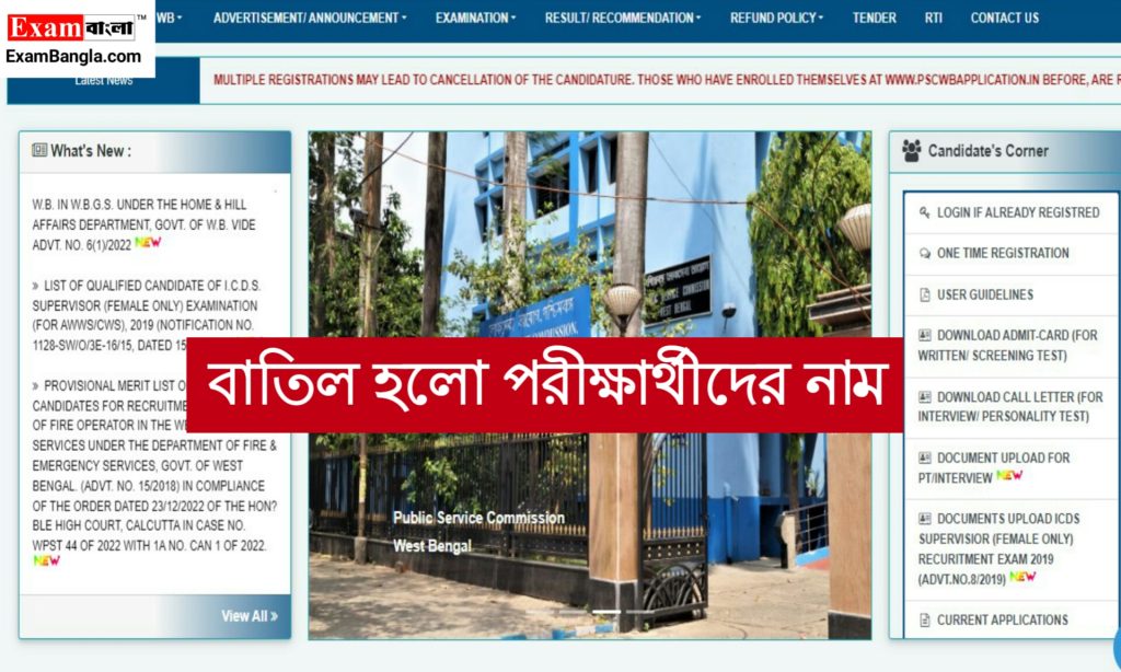 ওয়েস্ট বেঙ্গল পাবলিক সার্ভিস কমিশন (WBPSC) এর তরফে বহু পরীক্ষার্থীর নাম বাতিল করা হয়েছে। যে সকল পরীক্ষার্থীরা বাতিল হয়েছেন তাঁদের তালিকা বিজ্ঞপ্তির সাথে প্রকাশ করেছে কমিশন। গত ২৭শে এপ্রিল বিজ্ঞপ্তিটি কমিশনের ওয়েবসাইটে প্রকাশ পেয়েছে।