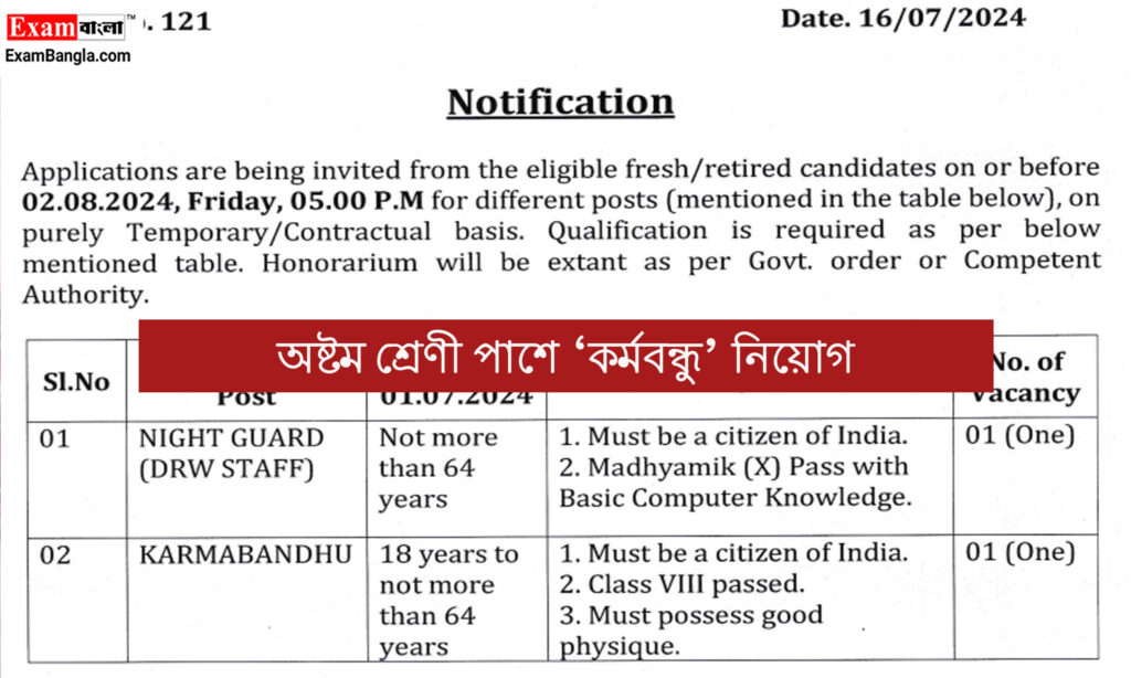 শিক্ষাগত যোগ্যতা— কর্মবন্ধু পদে আবেদন করার জন্য প্রার্থীকে নূন্যতম অষ্টম শ্রেণী উত্তীর্ণ হয়ে থাকতে হবে। নাইট গার্ড পদের জন্য প্রার্থীর নূন্যতম মাধ্যমিক পাশ করে থাকা জরুরি। পাশাপাশি বেসিক কম্পিউটার নলেজ থাকা আবশ্যক।