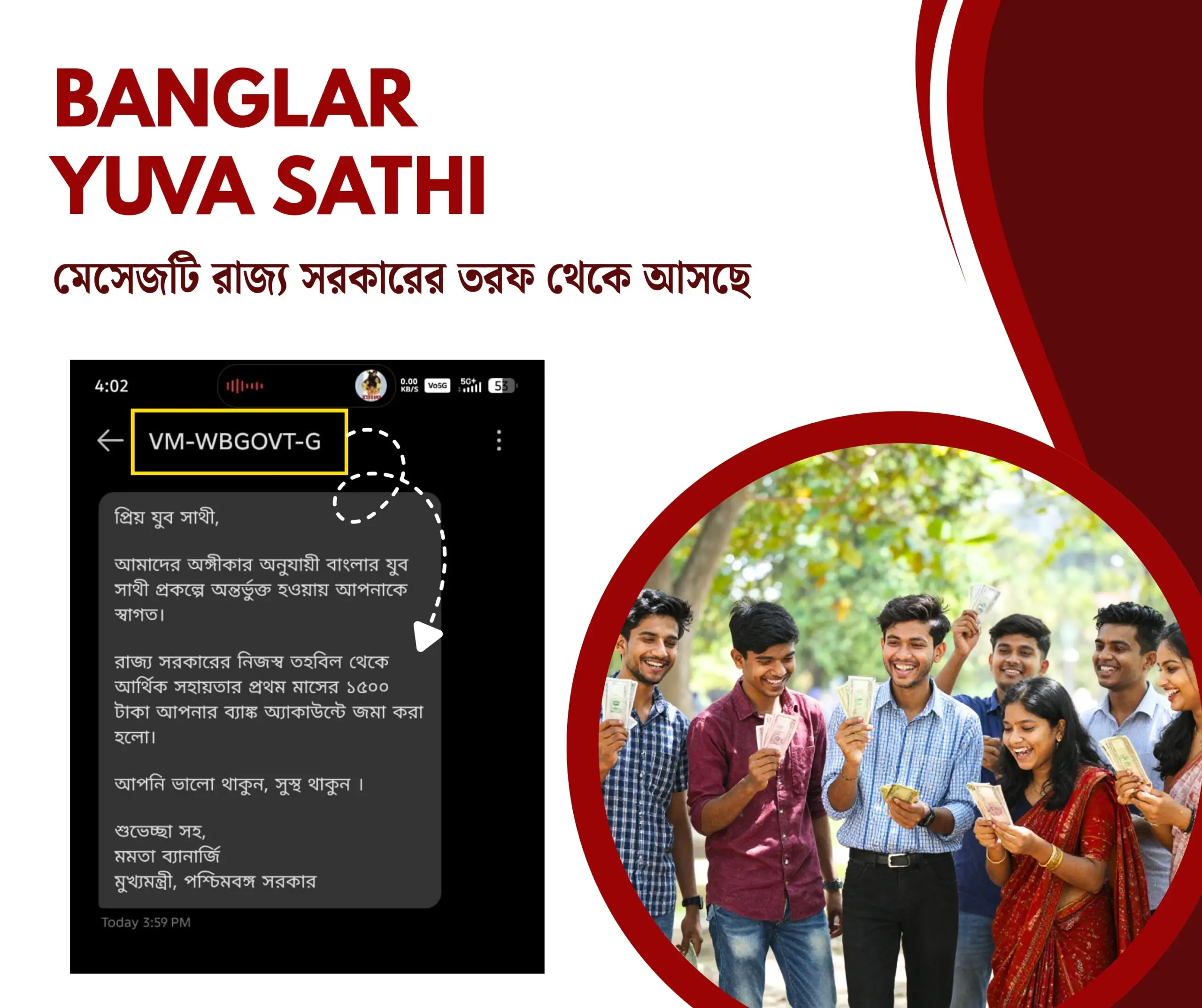 যুব সাথীর আবেদনকারীদের জন্য নতুন আপডেট। ইতিমধ্যেই যুব সাথী টাকা ঢোকা শুরু হয়েছে। তবে অনেকেই জানাচ্ছেন যে তারা সঠিকভাবে আবেদন করেছেন কিন্তু এখনো টাকা নাকি ঢোকেনি। সম্প্রতি এই সকল প্রার্থীদের জন্য নতুন আপডেট দিল রাজ্য সরকার। আপনার আবেদন যদি অ্যাপ্রুভ হয় এবং আপনি যদি যুব সাথীর টাকা পাওয়ার যোগ্য হন, তবে মোবাইলে একটি বিশেষ মেসেজ ঢুকবে। আর তারপরেই অ্যাকাউন্টে টাকা ক্রেডিট হবে। রাজ্য সরকারের তরফে জানানো হয়েছে যে যাদের এই মেসেজটি ঢুকবে না, তাদের যুব সাথী টাকাও ঢুকবে না। কি মেসেজ আসছে টাকা ঢুকলে? বিস্তারিত জেনে নেব নীচে।